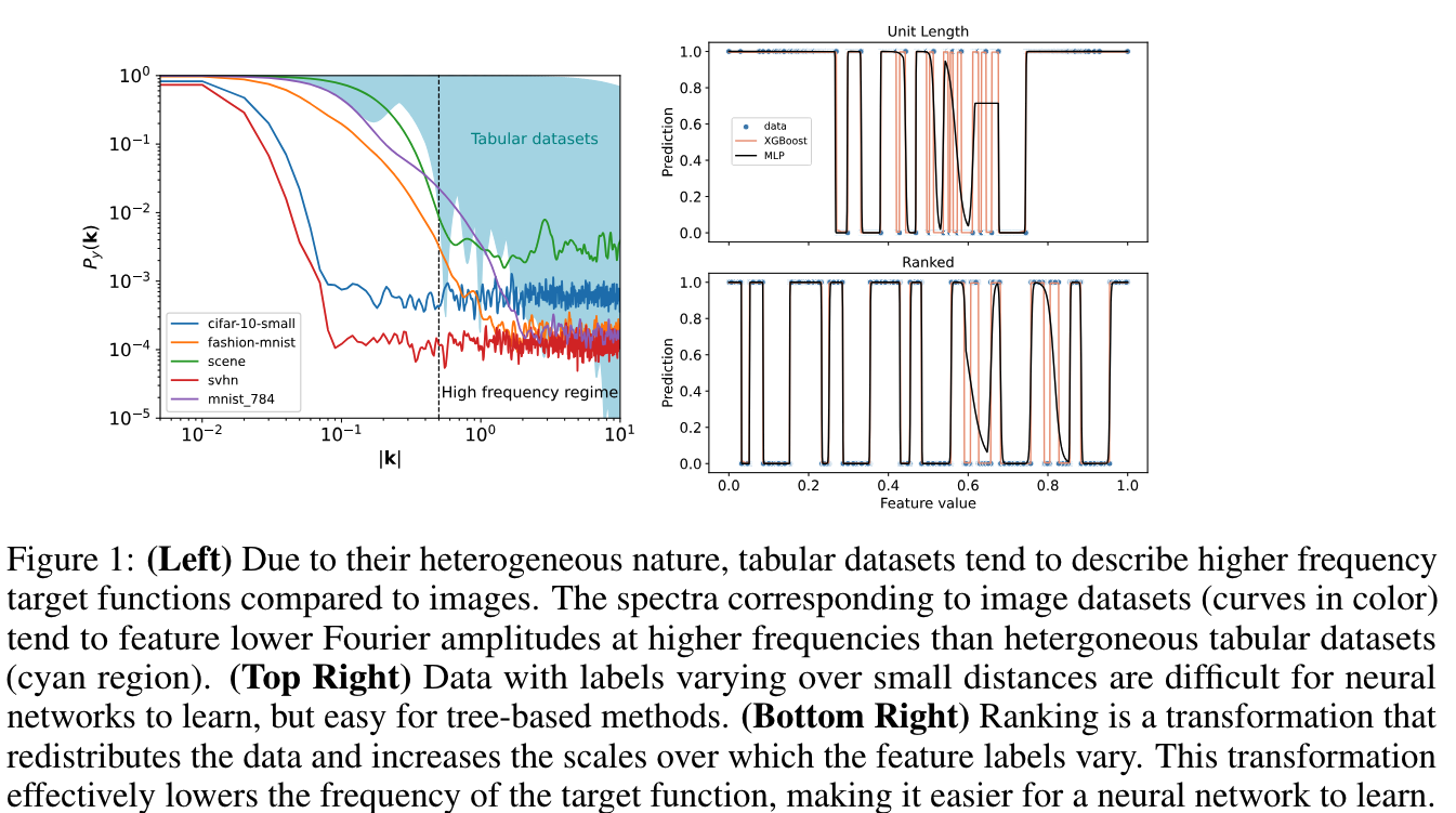 딥러닝 방법은 이미지, 텍스트, 오디오와 같은 데이터 모델링 작업에서 최첨단 성능을 보여주지만, tabular 데이터에서는 tree based approach보다 성능이 떨어지는 경향이 있다. 이 논문에서는 tabular 데이터의 heterogeneous한 특성으로 인해 타겟 함수가 불규칙해지고, 신경망이 smooth한 함수를 학습하는 경향이 성능 차이의 주요 원인이라고 가정했다.