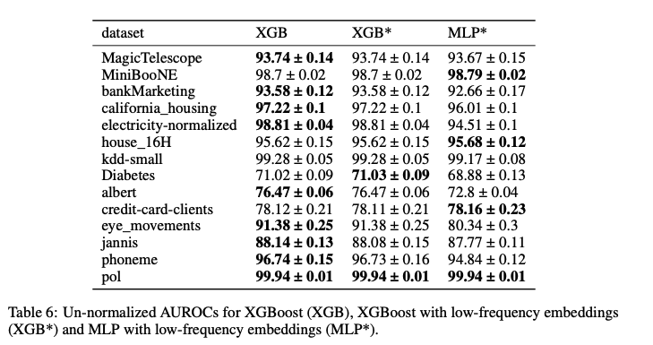 제안된 방법은 단순 신경망 모델(MLP)의 성능을 크게 향상시켰으며, 트리 기반 모델인 XGBoost와 비교했을 때도 경쟁력 있는 성능을 보였다. 특히, 높은 주파수 성분을 가진 데이터셋에서 제안된 방법의 성능 향상이 두드러졌다. 이는 주파수 저감이 신경망이 고주파 성분을 학습하는 데 도움을 준다는 것을 보여준다.