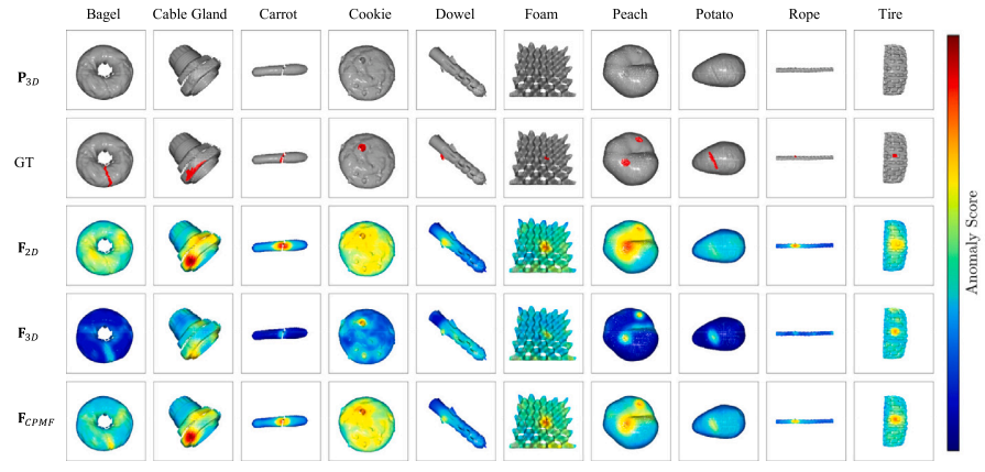 CPMF는 3D 정보와 2D 정보의 상호 보완적 관계를 잘 반영하여 작은 결함이나 구조적 이상을 잘 탐지하고, 복잡한 객체의 전역적 이상 탐지도 제대로 수행함.