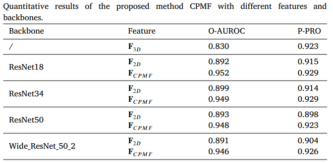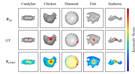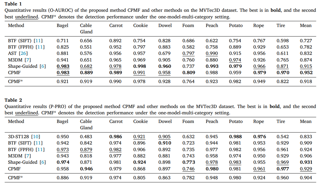 CPMF는 MVTec 3D 데이터셋에서 95.15%의 AUROC를 기록하며, 기존 방법론들보다 더 높은 성능을 보임.