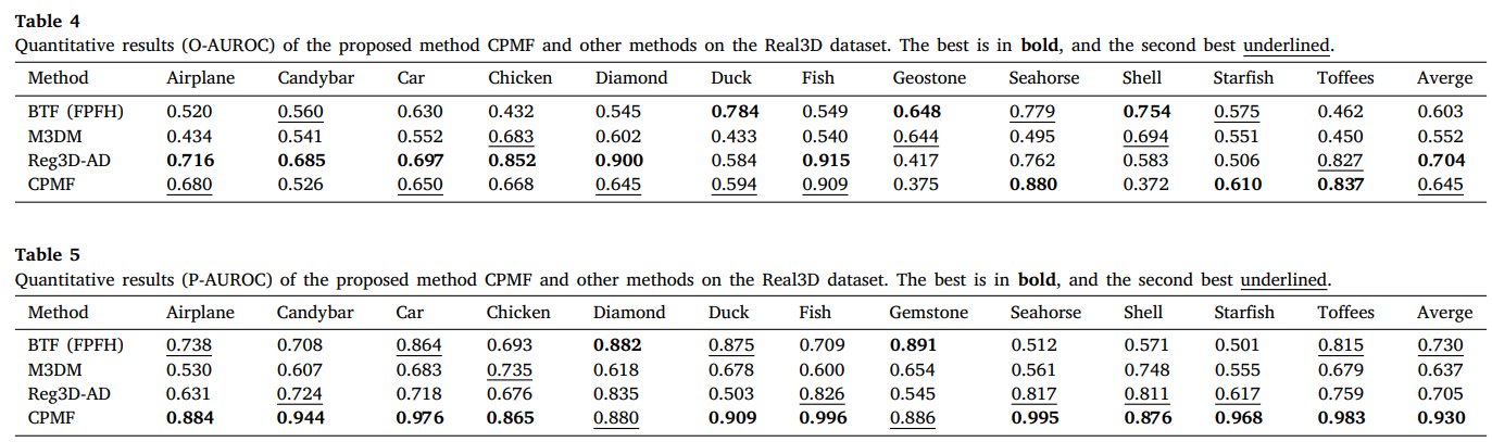 CPMF는 MVTec 3D와 Real3D 데이터셋에서 기존 방법을 능가하는 성능을 보여줌.