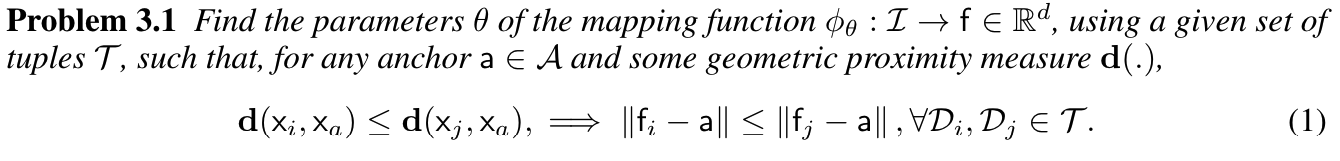 데이터(D) 구성은 (I,x) 쌍으로 구성되며, I는 이미지 샘플, x는 이미지의 기하학적 위치 정보이다. 그리고 는 CNN 모델이고, 세타는 모델 파라미터이다. 이를 통해서 이미지를 하나의 feature space에 매핑시킬 수 있다.