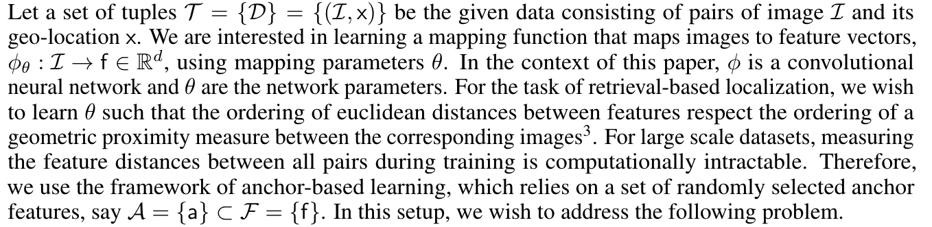 retrieval-based localization을 위해서는 image pair 간에 기하학적 근접성을 측정해서 ordering한 것이 feature간에 유클리디언 거리를 ordering한 것을 따르게하는 파라미터 세타()를 학습해야 한다.