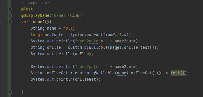 name2 테스트에서는 name이 null이어서, orElse와 orElseGet 메서드에 의해 test()가 총 2번 호출됨을 알 수 있습니다.