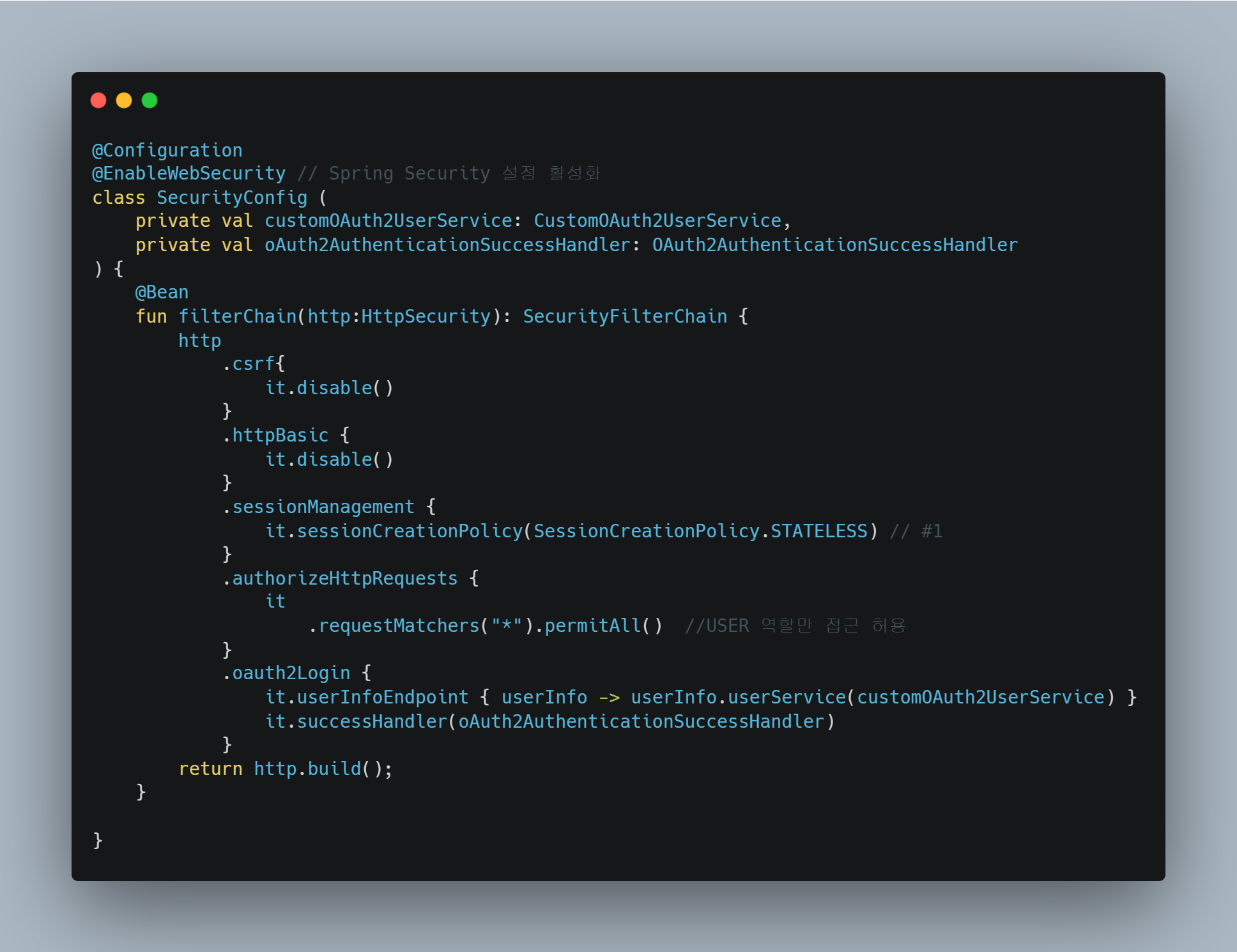 - 기본 OAuth2UserService 대신, 내가 만든 커스텀 OAuth2UserService를 사용하겠다는 설정