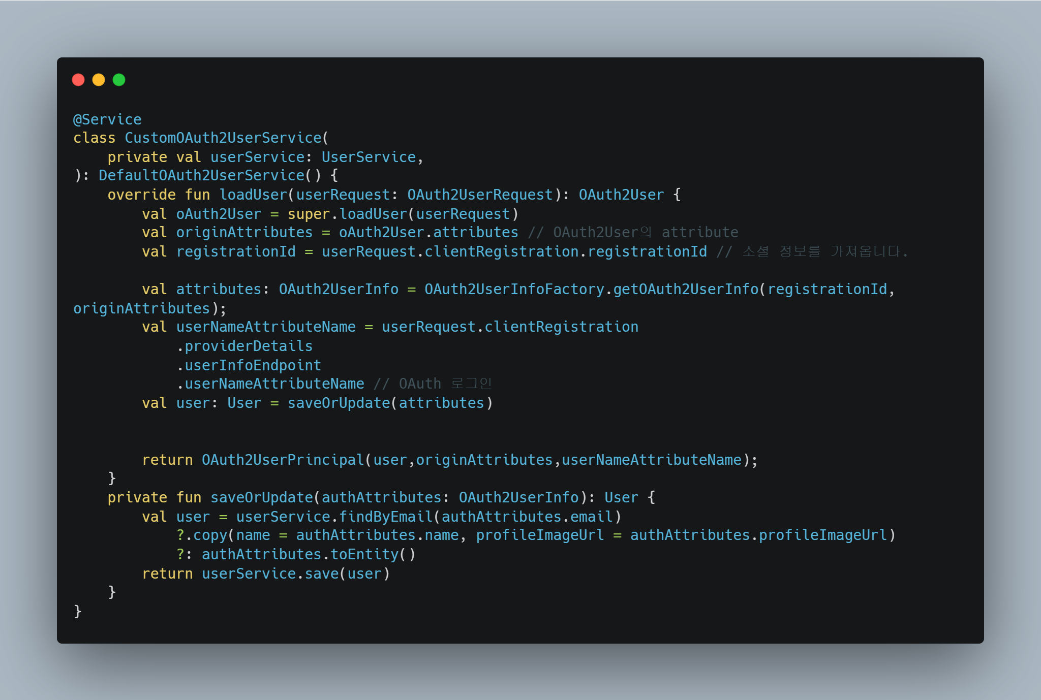 - customOAuth2UserService는 사용자의 이메일, 이름, 프로필 사진 등을 받아서, 사용자 DB 조회, 신규 사용자 저장, 기존 사용자 정보 업데이트 등을 처리하는 역할을 해