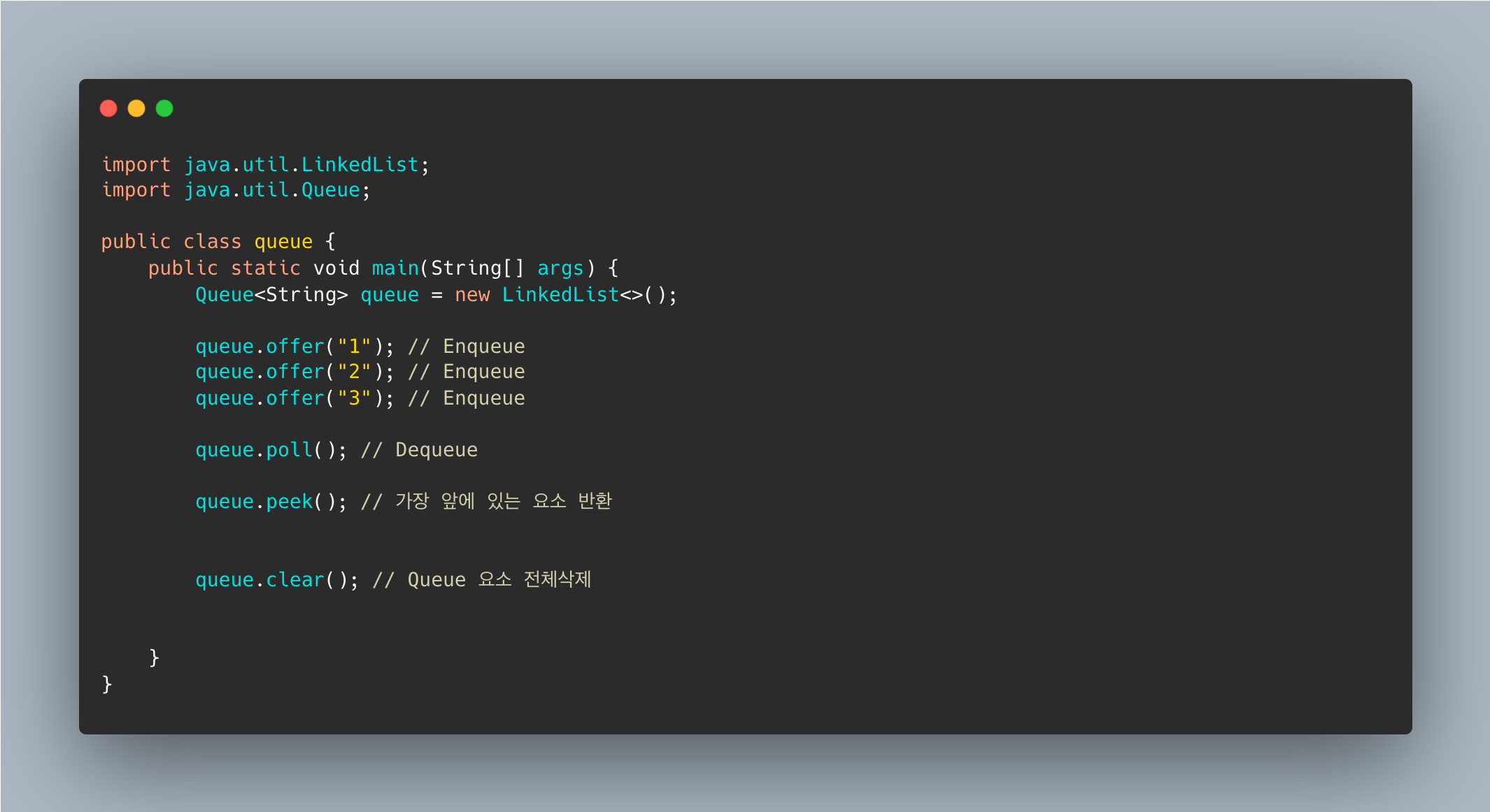 데이터가 들어오는 위치는 가장 뒤에 있고, 데이터가 나가는 위치는 가장 앞에 있어서, 먼저 들어오는 데이터가 먼저 나가게된다. 이러한 구조를 선입선출(FIFO)의 자료구조라고 하며 대기열이라고도 한다.