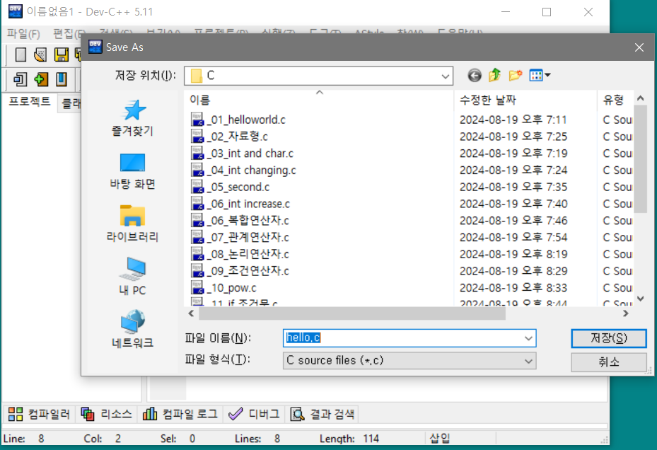 저는 hello에 확장자를 c로 저장하겠습니다.