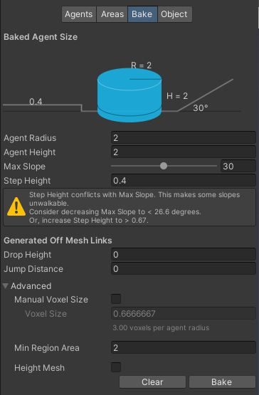 Max Slope - 에이전트가 횡단할 수 있는 NavMesh 경사의 최대 각도.