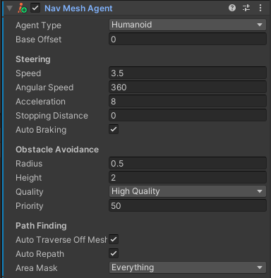 Obstacle Avoidance - 다른 에이전트 및 NavMeshObstacle와의 충돌을 피하기 위해 구성하는 부분. Radius와 Height는 해당하는 대로 사용. 품질(Quality)이 높을수록 충돌을 피하는 능력이 향상.