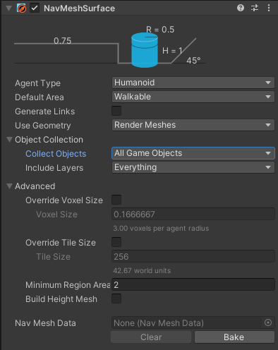 계산에 포함되는 Mesh 는 Navigation Static 속성을 가져야한다.