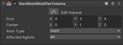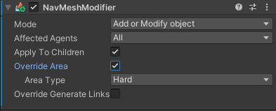 해당 오브젝트에 NavMeshModifier 컴포넌트 추가 후 Override Area 체크