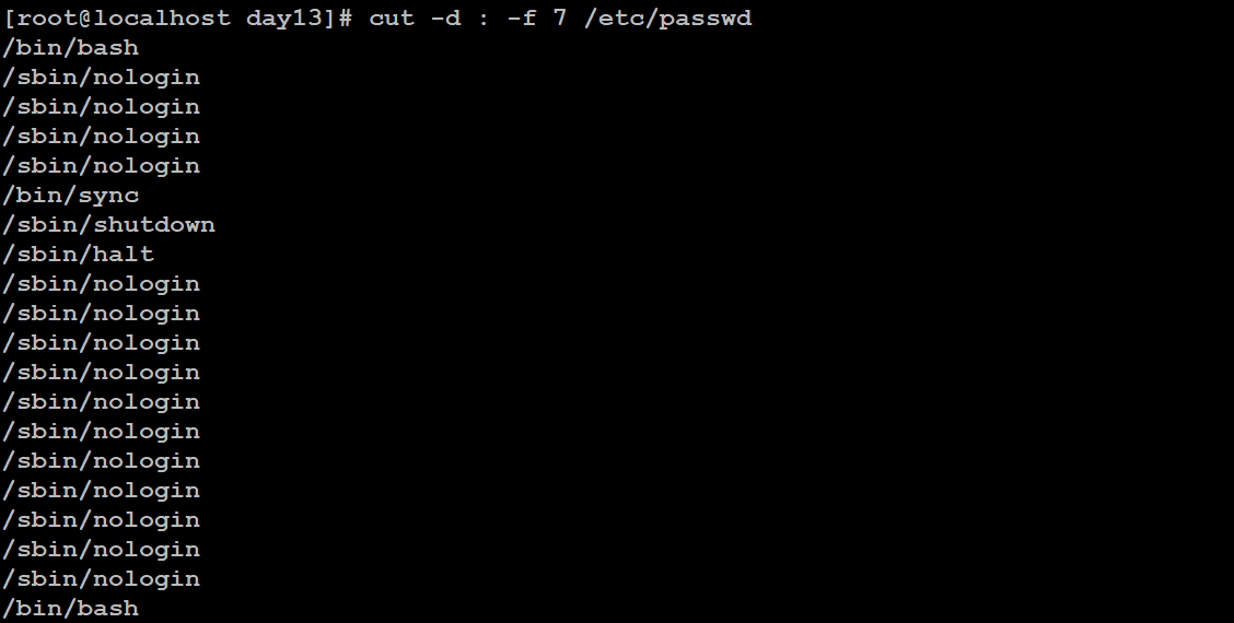 ex 1) $ cut -d : -f 7 /etc/passwd