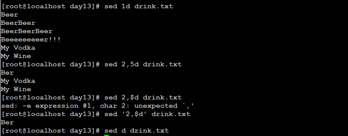 d -> 행 삭제. n,md -> n행에서 m행까지의 행 삭제($는 마지막 행을 의미), 주소 지정이 없는 경우 모든 행 삭제.