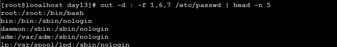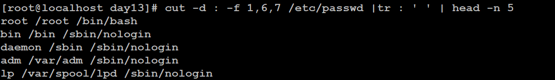 ex 2) $ cut -d : -f 1,6,7 /etc/passwd | head -n 5