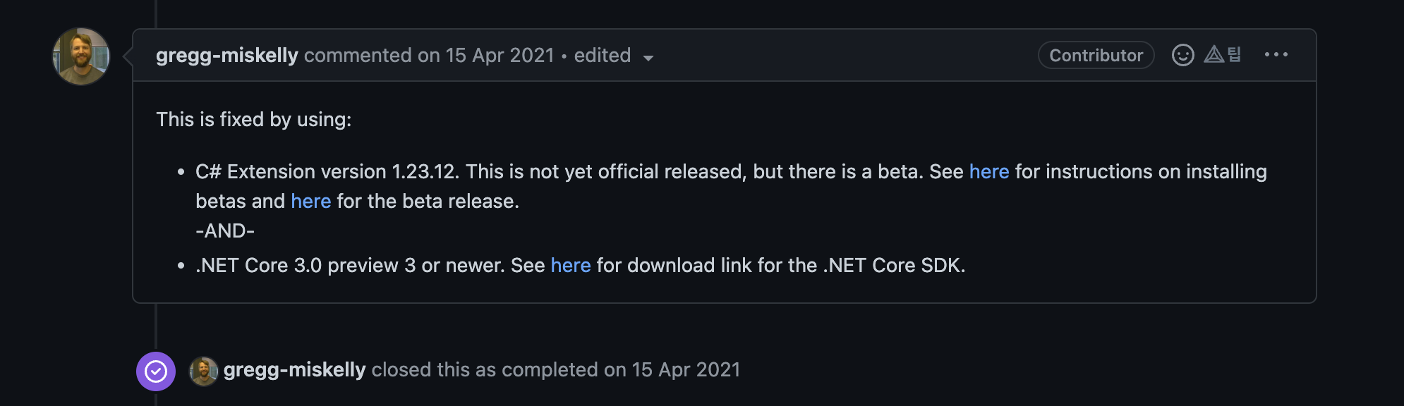 영어로 검색해서 하나씩 클릭해 봄...영어를 읽는데도 무슨 말인지 모르겠음. 번역까지 돌려보는데 대부분 말은 Restart OmniSharp 라는 말만 되풀이해서 나옮.
