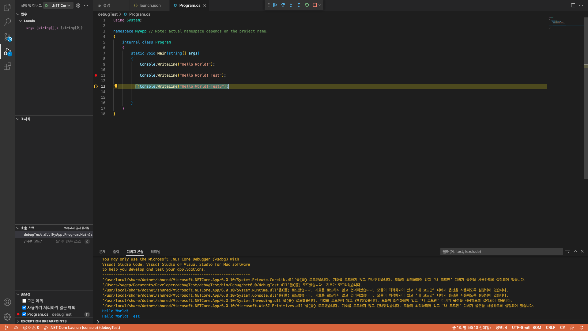 .dll 파일 경로로 넣어줘야 됨 상대경로얻기 워크플레이스 폴더 뒤에 붙여넣기 "program": "${workspaceFolder}/debugTest/bin/Debug/net6.0/debugTest.dll",