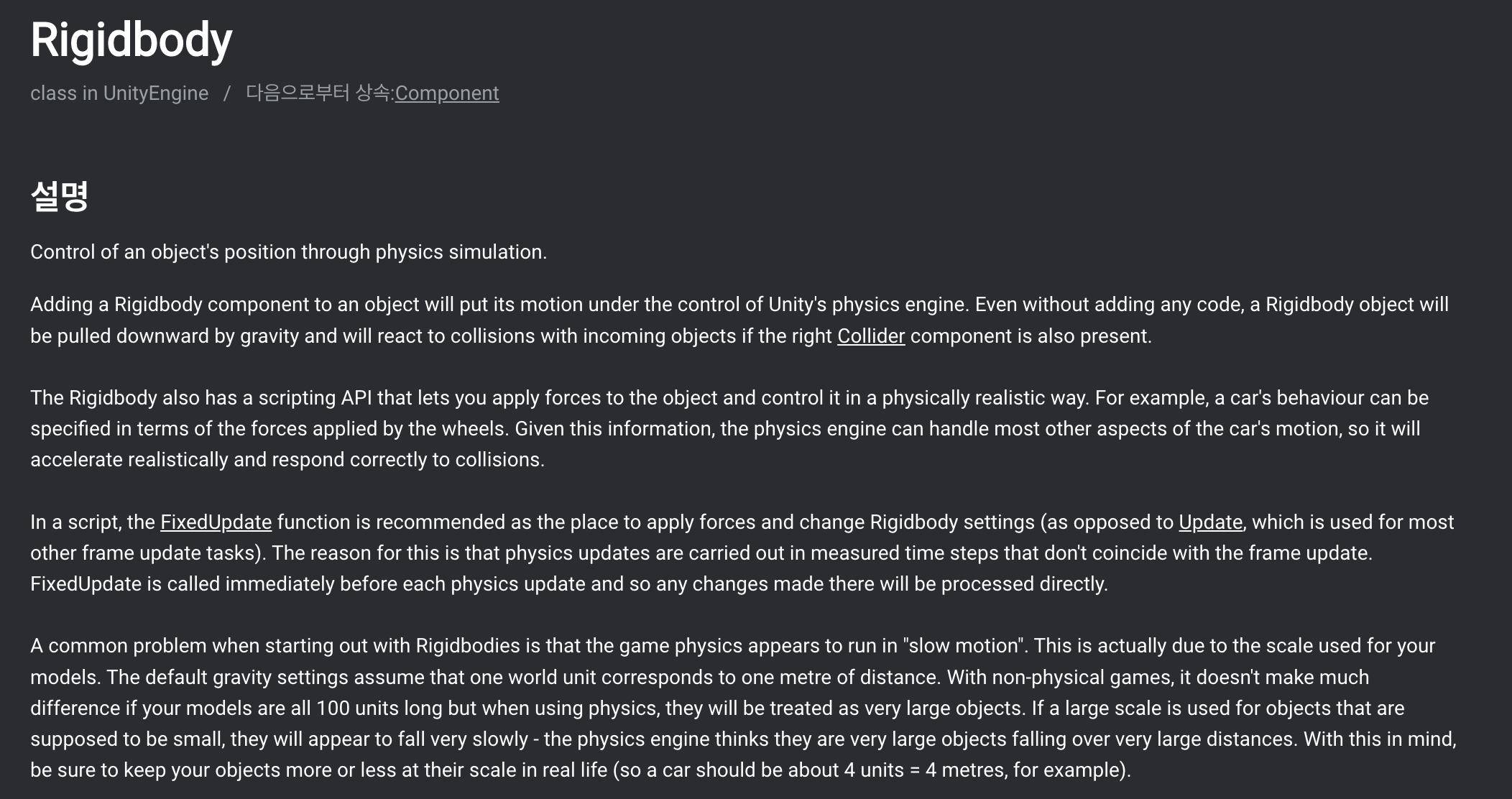 Adding a Rigidbody component to an object will put its motion under the control of Unity's physics engine. Even without adding any code, a Rigidbody object will be pulled downward by gravity and will react to collisions with incoming objects if the right Collider component is also present.
