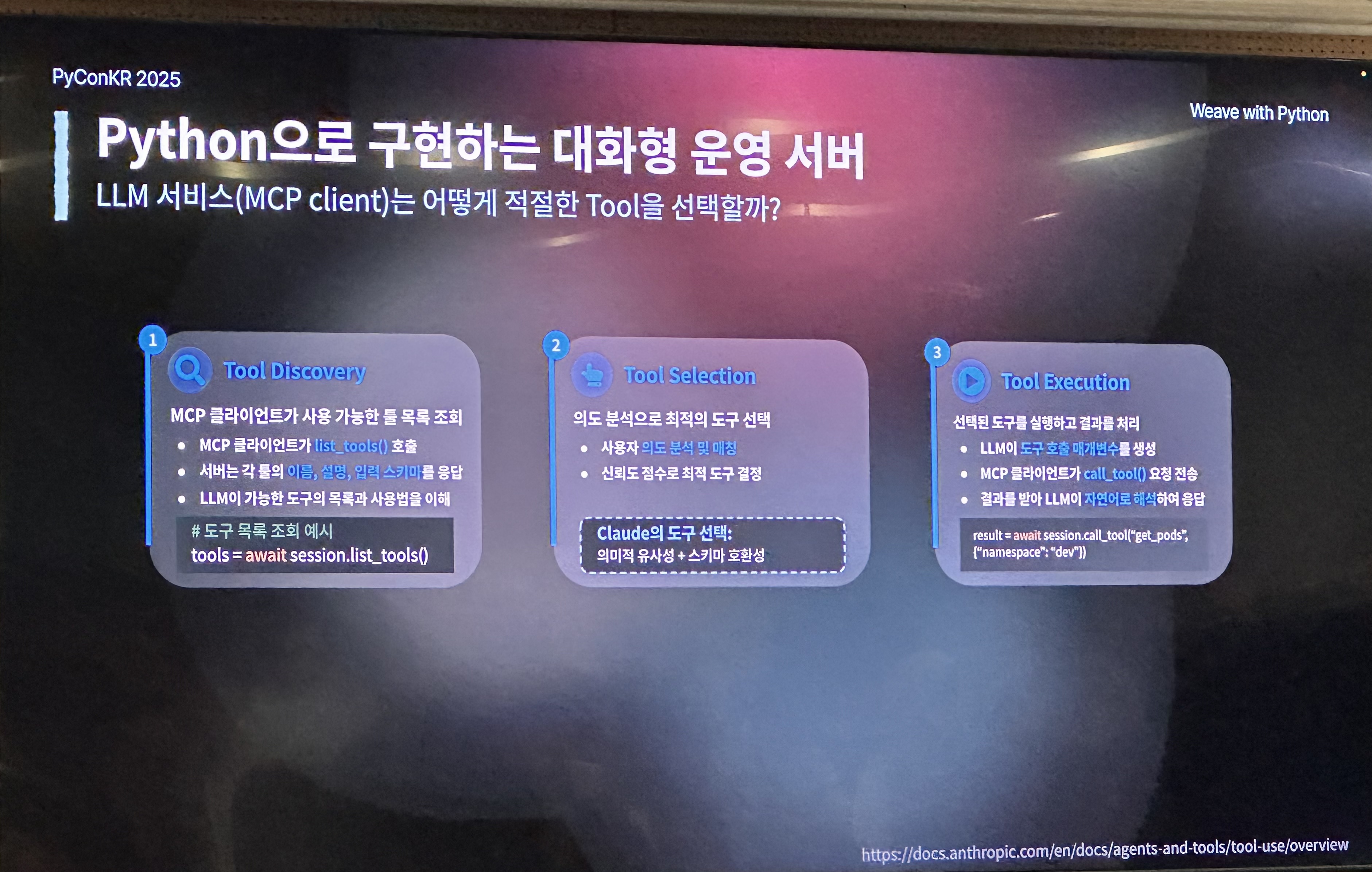 MCP가 적절한 툴을 선택하는 과정은 클라이언트가 사용 가능한 툴 목록 조회 -> 의도 분석해 최적의 도구 선택 -> 선택한 도구 실행 및 결과 처리 순서로 이루어진다.