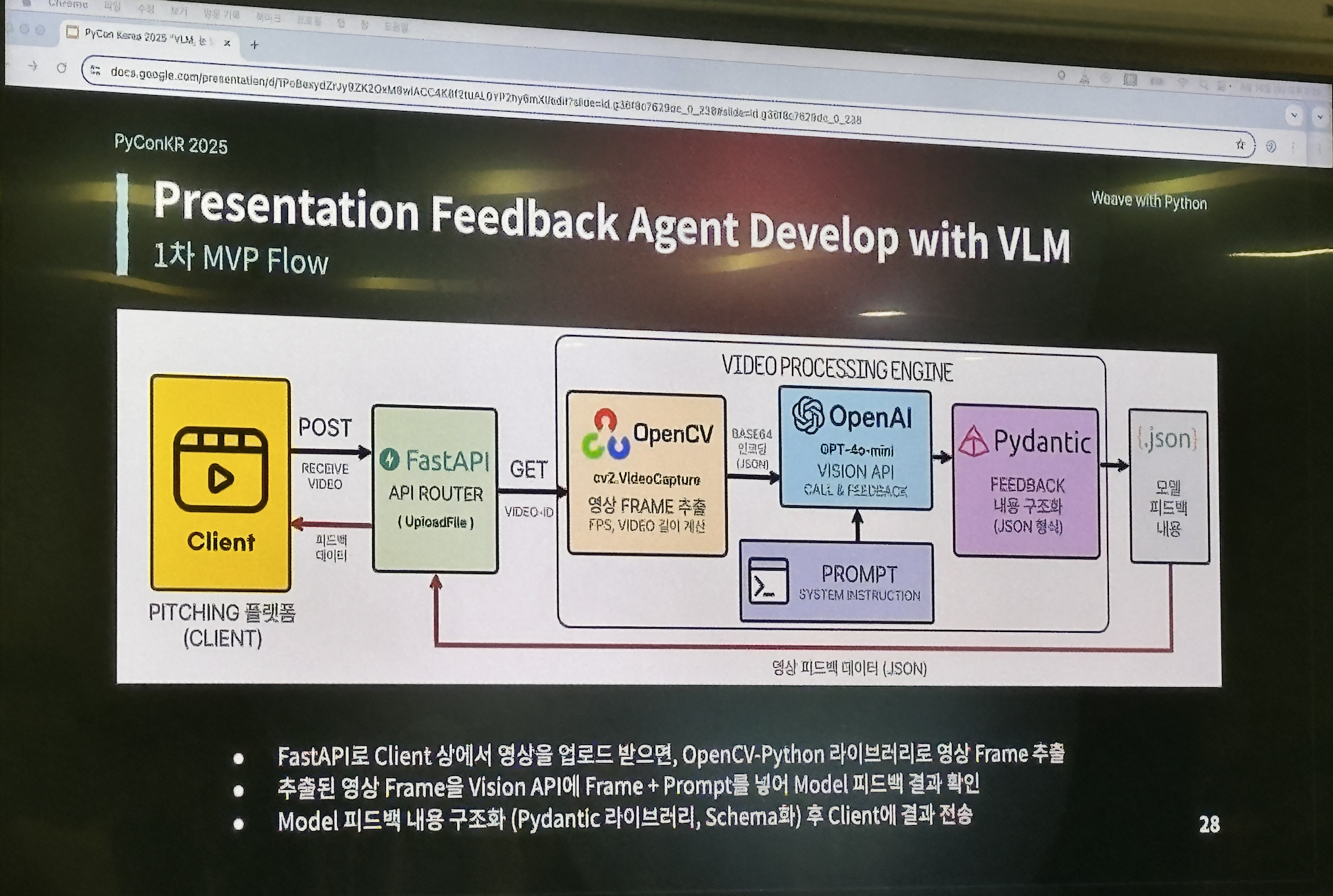 LLM과 비교하여 VLM의 작동 원리에 대한 설명과 VLM을 활용한 발표 영상 피드백 모델을 개발한 경험을 소개해주었다.