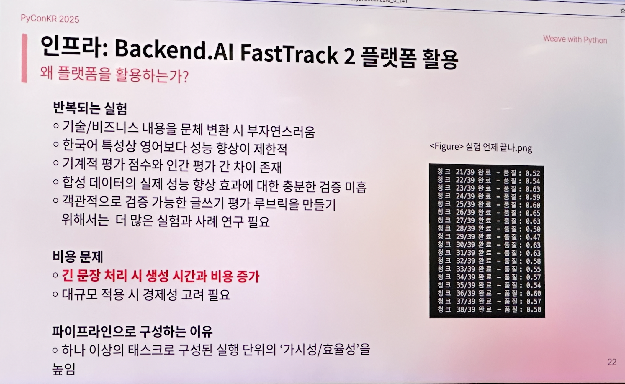지속적으로 고품질의 데이터를 만들기 위해 데이터 구축 뿐만 아니라 데이터 구축 파이프라인 만드는 것을 강조하셨고, 이를 위해 자사 제품인 Backend.AI 를 사용해 실험을 진행했다.