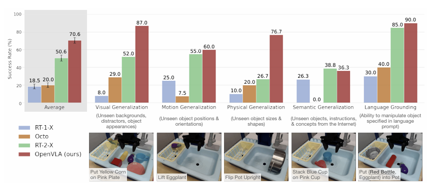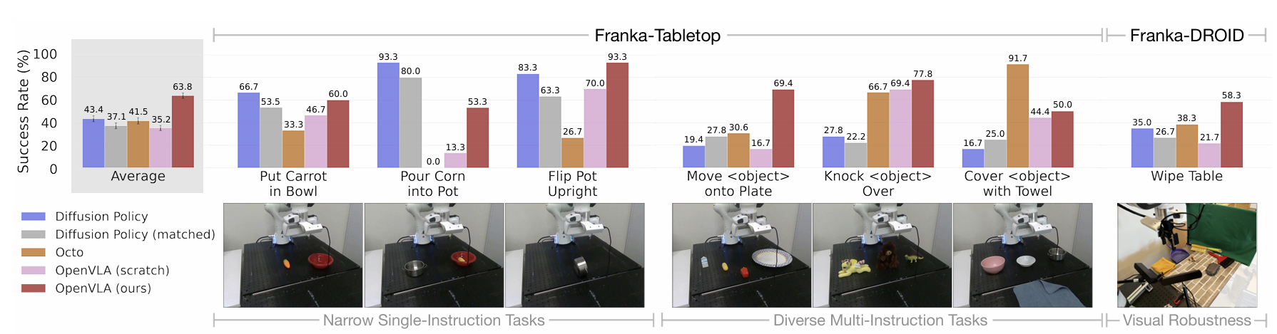 위 그래프는 OpenVLA와 다른 모델들이 Franka-Tabletop 및 Franka-DROID 환경에서 수행한 Task 성공률을 보여준다. OpenVLA는 다양한 작업 환경과 지시사항에 대해 범용적이고 안정적인 성능을 발휘했다.