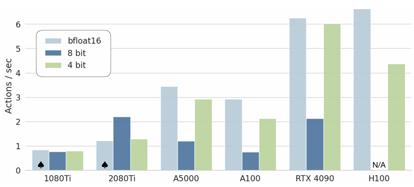 위 그래프에서 알 수 있듯이, 4비트 양자화는 메모리 효율성과 성능 사이의 최적 Trade-off를 제공한다. 이를 통해 OpenVLA는 소비자 GPU(예: RTX 4090)뿐 아니라, 구형 GPU(A5000)에서도 실질적으로 실행 가능하다.