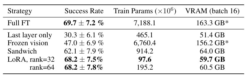 즉, LoRA는 성능과 계산 비용 간의 최적 균형을 제공하며, OpenVLA의 새로운 작업에 대한 효율적이고 실용적인 Finetuning 방법으로 추천한다.