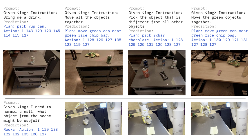 위 그림의 첫 번째 예시에서는 "Bring me a drink"라는 지시를 받고, 모델은 먼저 계획으로 " pick 7up can"를 세운 후, 로봇이 지정된 좌표로 이동하여 7up 캔을 선택하는 동작을 수행한다.