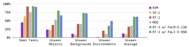 이로 인해, RT-2는 새로운 객체에 대한 일반화가 크게 향상되었고, 로봇의 학습 데이터에 없던 명령어도 해석할 수 있게 되었다. 예를 들어, 특정 번호나 아이콘 위에 물체를 놓는 등의 명령도 수행할 수 있다. 또한, 단계별 추론이 가능해져, 예를 들어 피곤한 사람에게 적합한 음료(에너지 드링크)를 선택하는 등의 다단계 의미적 추론도 수행할 수 있다.