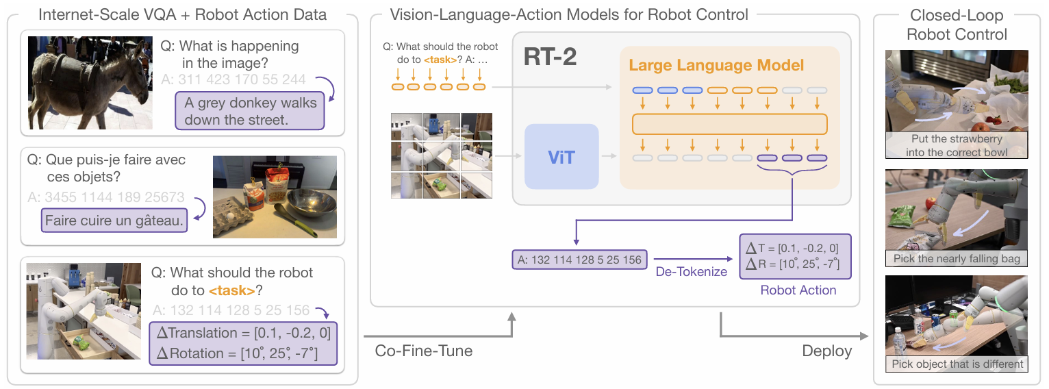 위 그림은 RT-2의 전체적인 개요도이다. 왼쪽 섹션에서는 Internet-Scale VQA와 Robot Action Data에 대한 샘플이 제시된다. 이 데이터들로 Co-Fine-Tune을 하여 RT-2를 학습시키고 Deploy하여 Action을 출력하게끔 한다.