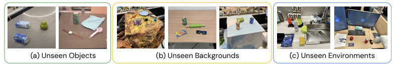 Scratch 학습에서는 5B 모델에서부터 성능이 매우 낮았으며, 이에 따라 55B 모델은 Scratch 학습을 생략하였다. 이는 사전 학습 없이 로봇 데이터를 처음부터 학습하는 것이 일반화 성능에 크게 불리하다는 것을 보여준다. 반면, Co-Fine-Tuning은 모든 모델 크기에서 단순히 로봇 데이터로만 Fine-Tuning 하는 것보다 더 나은 일반화 성능을 보다. 이는 VLM 사전 학습 데이터를 계속 유지하면서 로봇 데이터를 추가 학습하는 것이 모델이 이전에 학습한 개념을 잊지 않도록 돕기 때문으로 해석된다. 모델 크기는 모델 크기가 커질수록 일반화 성능이 향상되었다.