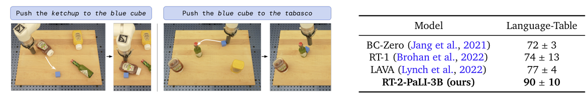 Language-Table 환경은 로봇이 주어진 텍스트 지시를 이해하고 해당 물체를 특정 위치로 이동하는 Task를 말한다. 위 그림의 왼쪽은 RT-2 모델이 케첩을 파란색 큐브로 밀거나, 파란색 큐브를 타바스코 쪽으로 이동하는 방식으로 지시를 수행하는 과정이다. 오른쪽은 Language-Table 환경에서 RT-2-PaLI-3B 모델이 가장 높은 성능이라는 것을 알 수 있다. 이는 RT-2 모델이 VLM에서 학습된 관계 이해 능력을 Transfer하여, 더 복잡한 지시를 정확히 수행할 수 있음을 시사한다.