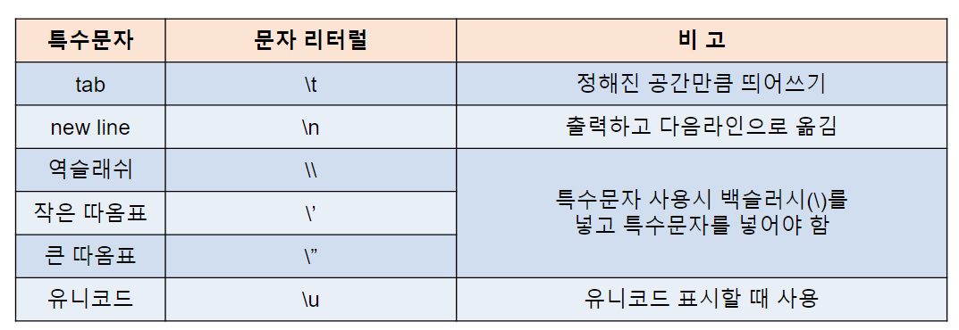 // escape(이스케이프 == 탈출) 문자 : 일반 문자가 아닌 특수문자 표현