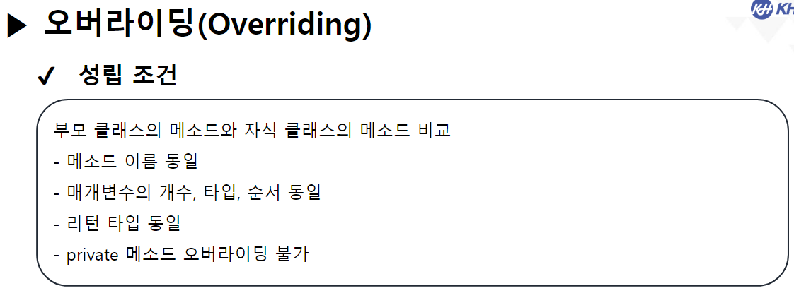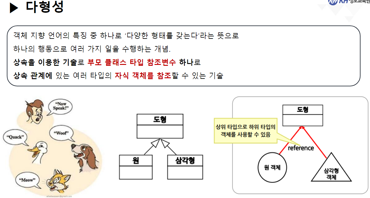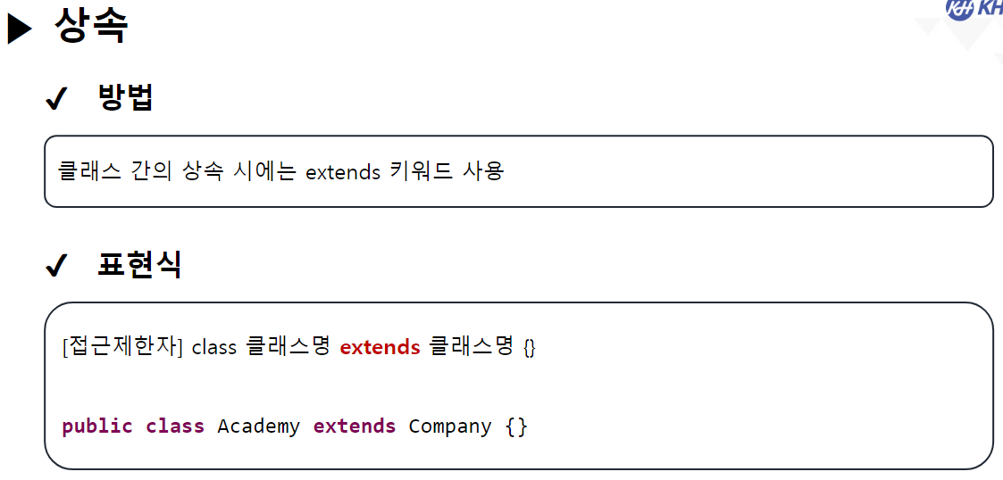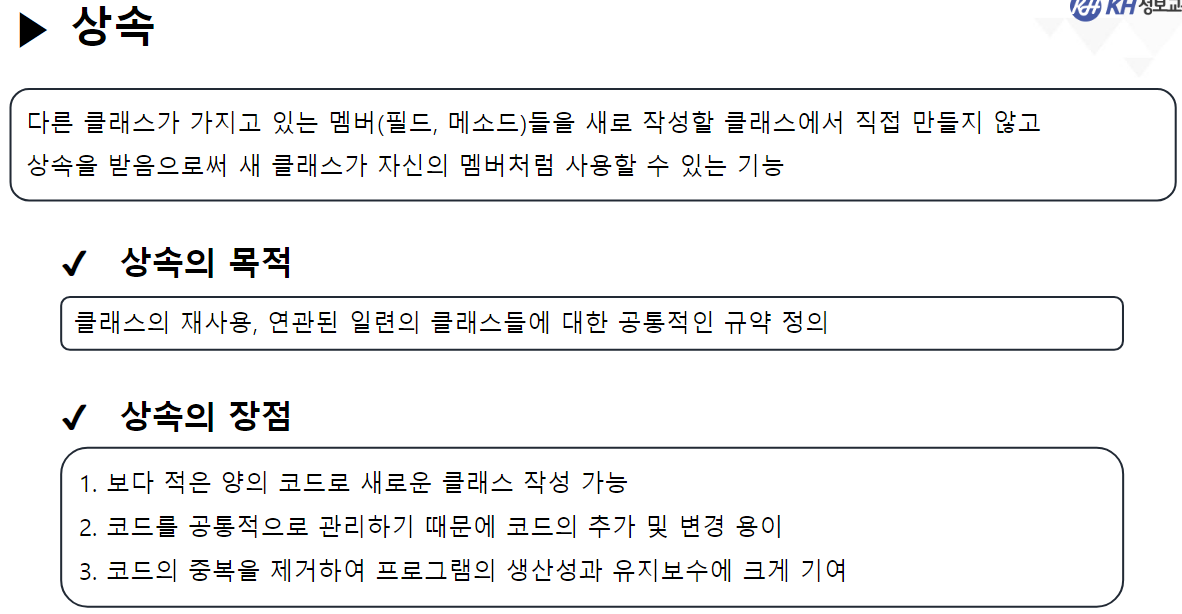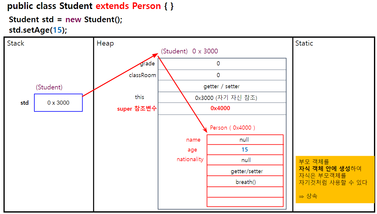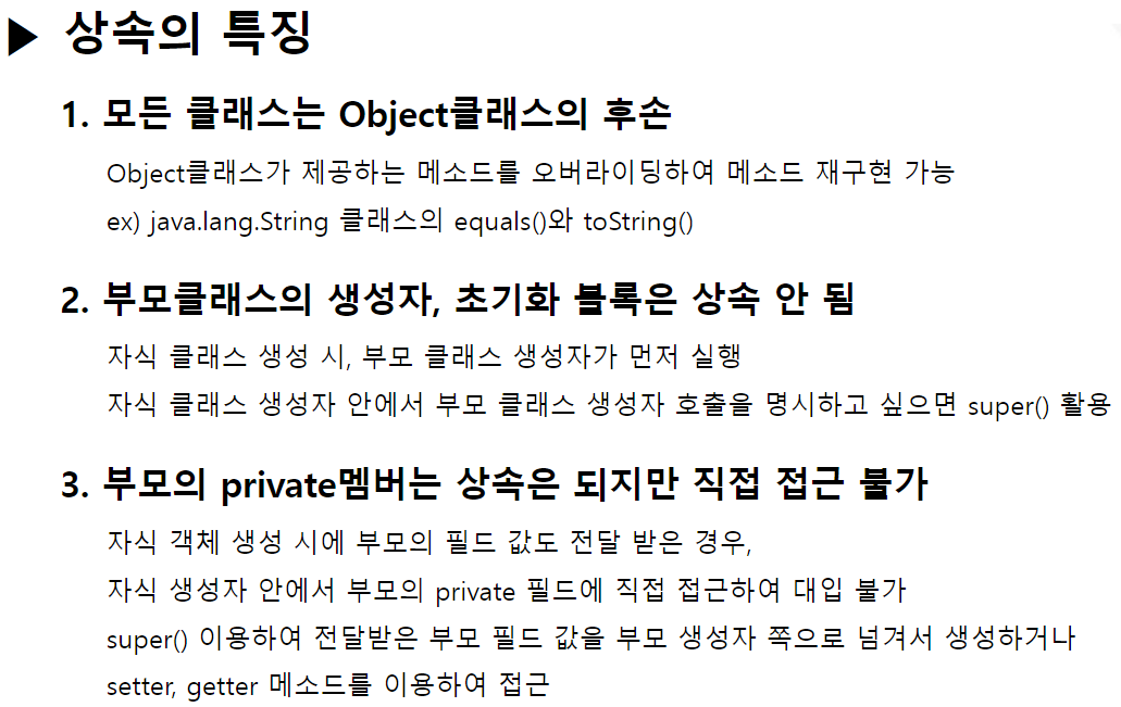 - 상속(다형성의 베이스) = 부모객체(속성,기능 = 필드+메서드)를 자식객체에게 물려주는 것 -> 메모리구조 중요!