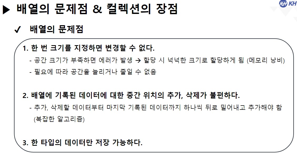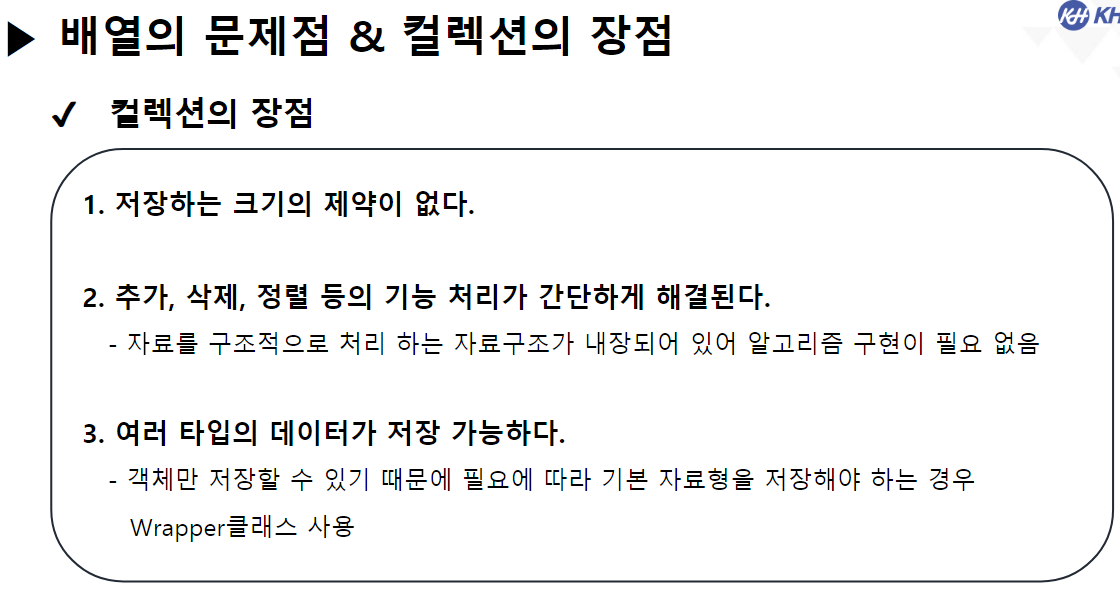 // -> 컬렉션 특징 : 여러 타입의 데이터를 저장할 수 있다.