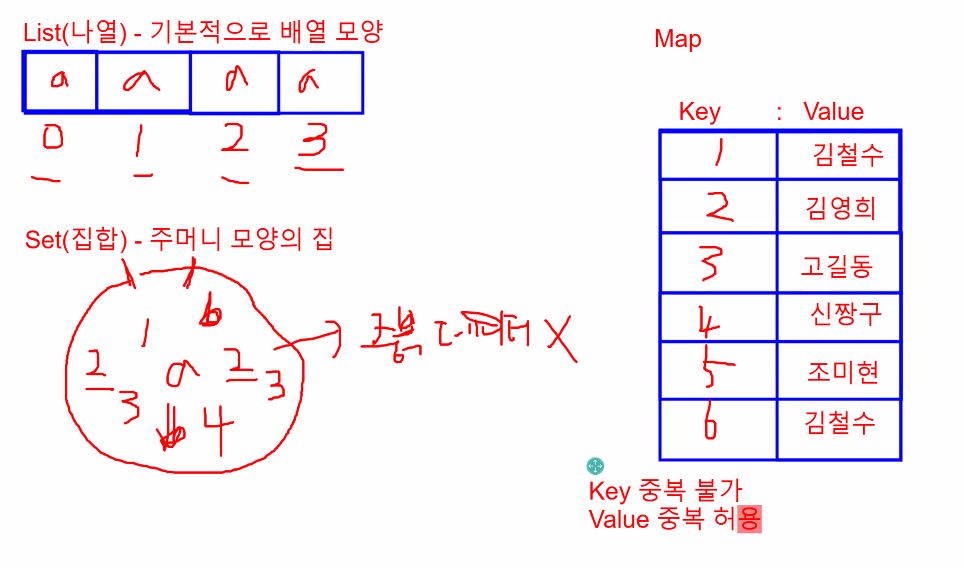 List, Set, Map = 배열보다 진화된 형태(여러 데이터를 관리하기 위함)
