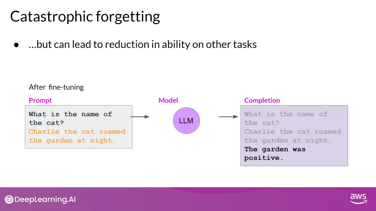 예를 들어 fine-tuning을 통해 리뷰를 검토하여 감정 분석을 수행하는 모델에서는 성능이 향상되어 품질을 높일 수 있지만, 해당 모델이 다른 작업을 수행 하는 방법을 잊을 수 있습니다.