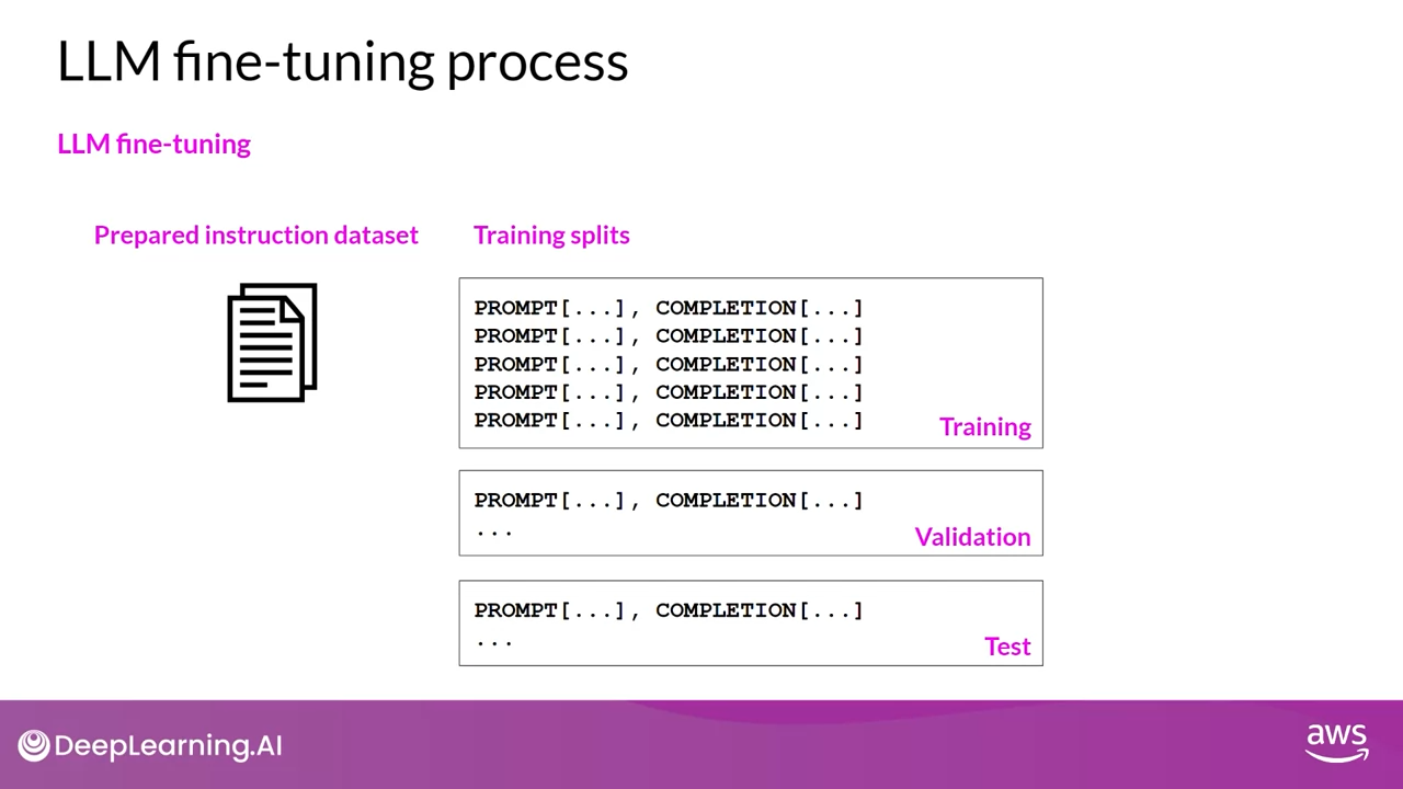 supervised learning과 마찬가지로 Instruction데이터 세트를 준비했으면 데이터 세트를 Training, Validation, Test로 나눕니다.