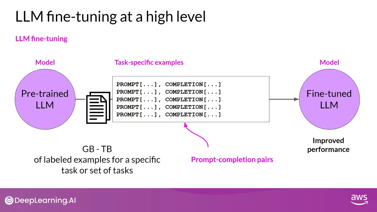 self supervised learning을 통해 방대한 양의 비정형 텍스트 데이터를 사용하여 LLM을 훈련하는 pre-training과 달리, Fine-tuning은 레이블이 지정된 예제로 구성된 데이터 세트를 사용하여 LLM의 가중치를 업데이트하는 supervised Learning 프로세스입니다.