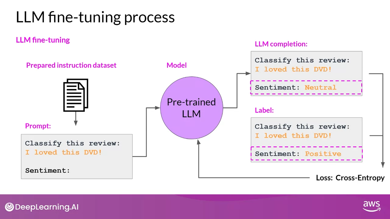 Fine-tuning 중에 training 데이터 세트에서 프롬프트를 선택하여 LLM에 전달하면 완료 결과가 생성됩니다. 다음으로 LLM completion을 training데이터에 지정된(Lable) 응답과 비교합니다.