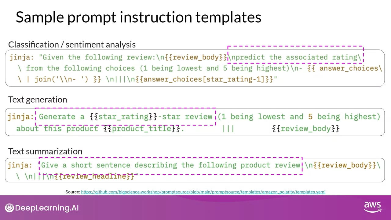 각각의 경우에 review_body라고 하는 원본 리뷰를 템플릿에 전달하면 관련 평점 예측, 별점 평가 생성 또는 다음 제품 리뷰를 설명하는 짧은 문장 작성과 같은 지침으로 시작하는 텍스트에 삽입되는 것을 볼 수 있습니다.