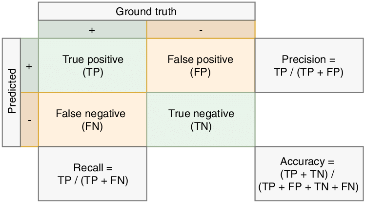 위와 같은 표를 confusion matrix라고 합니다. 여기서 Ground Truth는 실제 정답에 해당되는 값이고, Predicted는 예측 결과 값입니다.