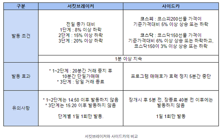 즉, 주가지수가 일정 수준 이상의 변동폭을 보일 때 시장 전체의 매매를 중단시켜 급격한 자본 유출에 따른 투자자들의 손실을 최소화 하는 제도이다.