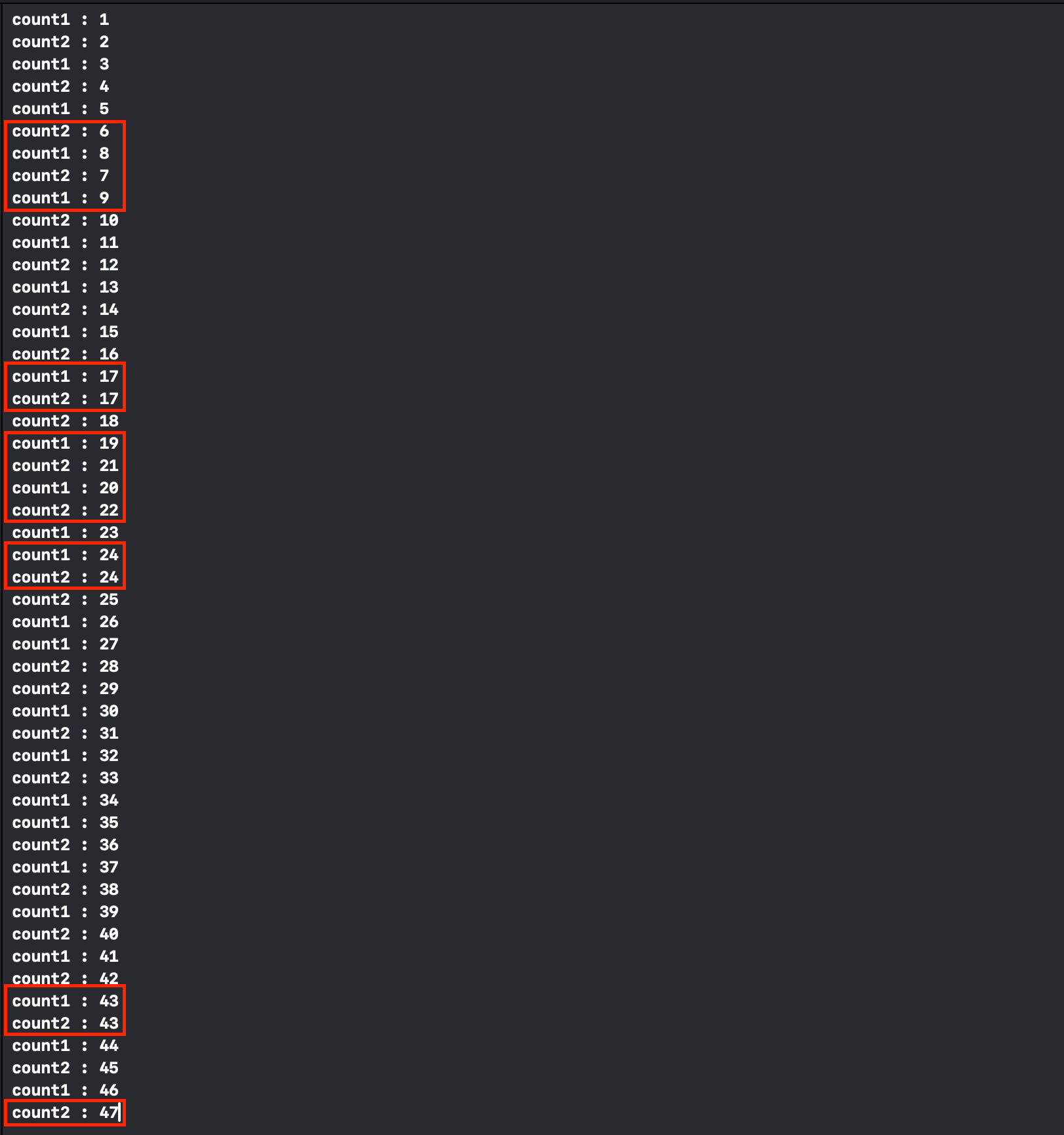 Data race가 발생하는 상황을 직관적으로 보기 위해 아래의 코드를 실행해 보면