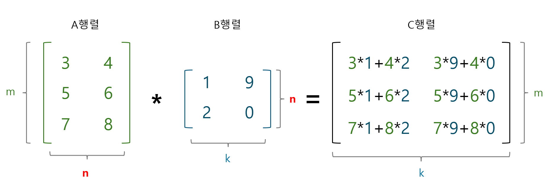 위 그림에서 n이 같아야하며, 결과행렬의 모양은 (m, k)행렬이 된다.