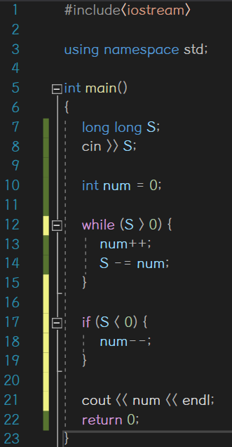 원래는 1부터 더해가는 방식으로 풀었으나, 자꾸 틀려서 1부터 빼는 방식으로 코드를 새로 작성했다