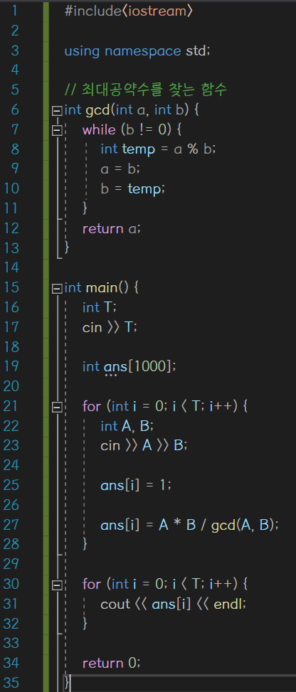 처음에는 for문 안에 while문과 또다른 for문을 넣어 복잡하게 해결하려고 했으나, 그 while문에서 예외 처리 오류가 자꾸 나서 구글링을 해보고 수정했다 최소공배수는 두 수의 곱을 최대공약수로 나눈 것과 같기 때문에 gcd를 사용했다