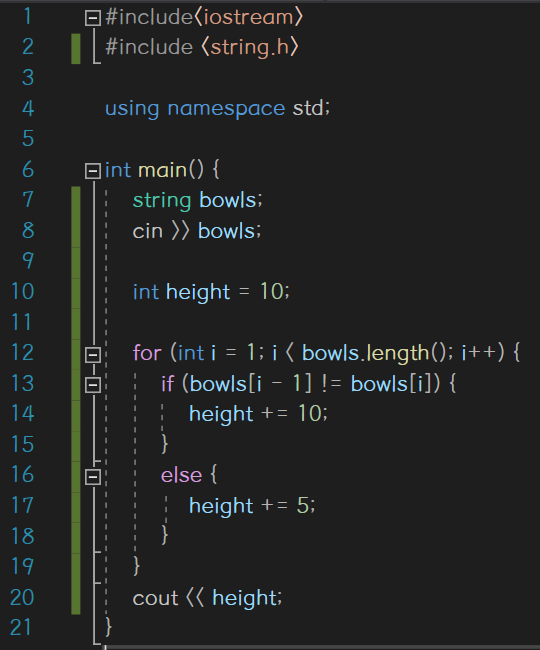 앞뒤 그릇을 모두 비교할 수 있게 for문을 사용했다 앞의 그릇과 비교하여 다르면 +10, 같으면 +5를 하도록 if-else문을 작성했다