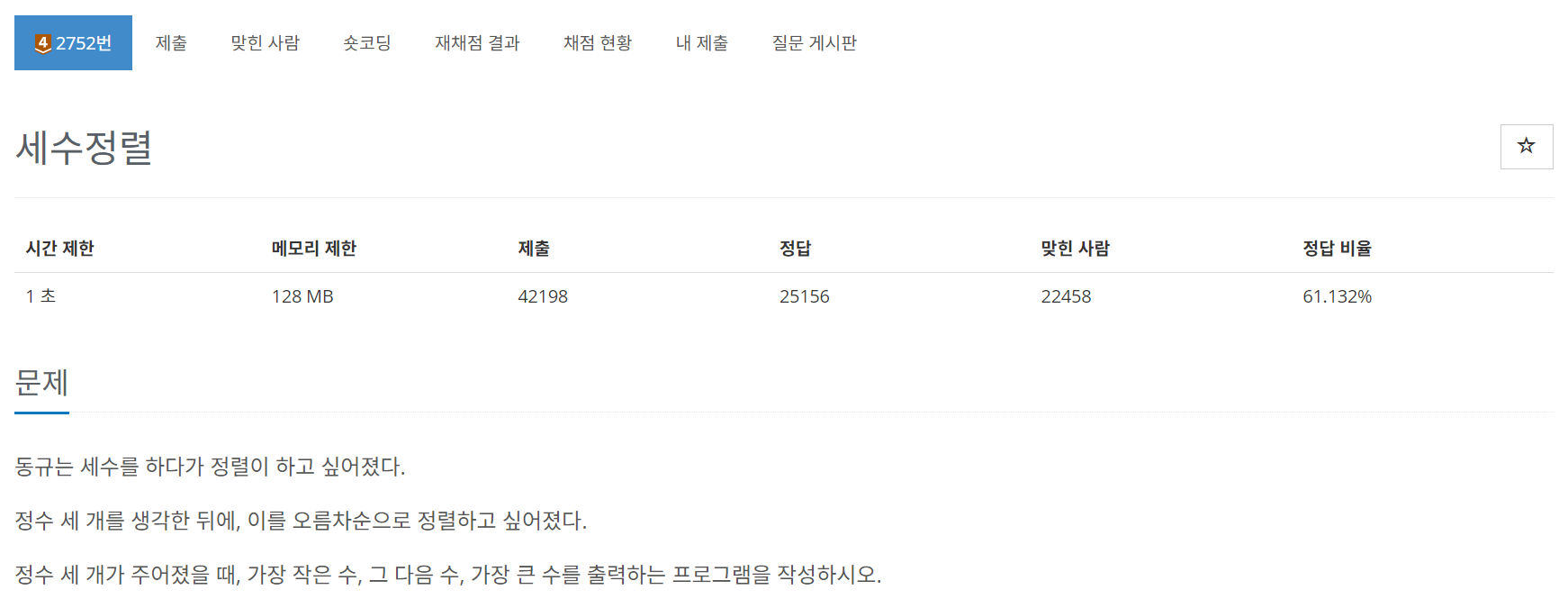 수를 세 개 받아서 정렬 후 출력하도록 하였다